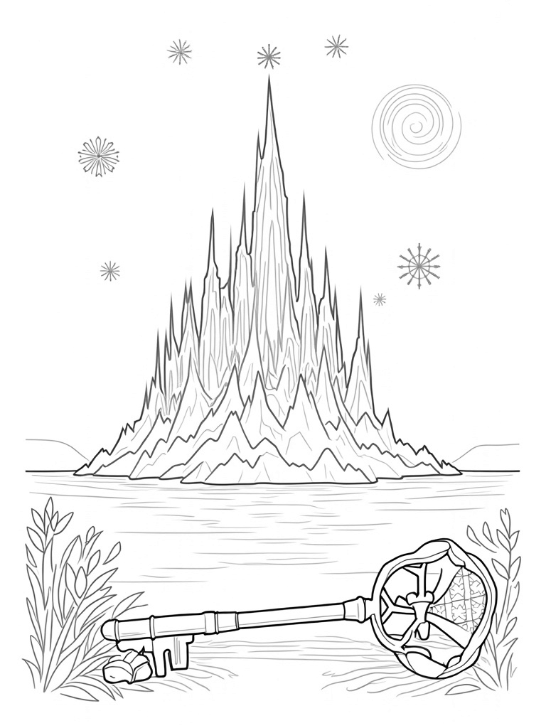 At the base of the castle, you'll find a whimsical frozen garden filled with frosted flowers in vibrant geometric shapes. It’s like a winter wonderland where nature has turned into art! And don’t miss the large, ornate key made of icicles, half-buried in the snow—what secrets might it unlock within the castle walls?