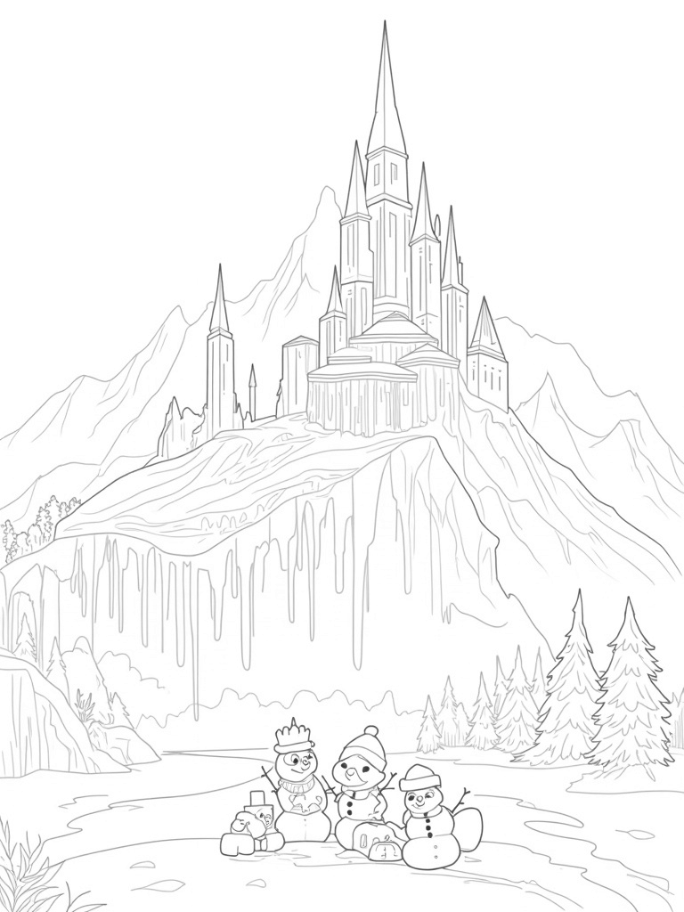 Imagine a stunning ice palace sitting atop a steep, snowy mountain. The palace has towering spires made of shimmering ice that catch the light just right, making them sparkle like diamonds. Surrounding it, you’ll find a frozen river that winds around the mountain, with beautiful frost-covered trees lining the banks. And let’s not forget the whimsical snowmen standing at the entrance, each wearing their own unique hat and greeting everyone with big, cheerful smiles!