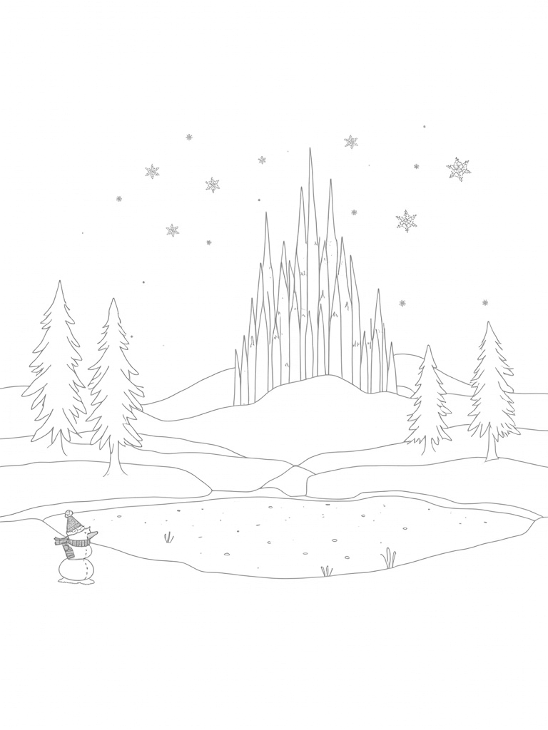 Check out this free, printable coloring page featuring a majestic ice palace under a swirling aurora. Kids will love coloring the snowman and the beautiful winter scenery in this fun scene from our Elsa category!