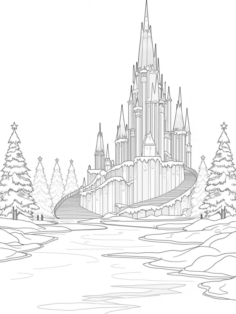 Outside the palace, there’s a serene frozen lake that perfectly mirrors the sky above, making it feel like a scene from a dream. Snow-covered pine trees frame the scene, their branches glistening with frost as if they’ve been sprinkled with fairy dust. It’s the perfect place for your imagination to run wild while you add your splash of color!