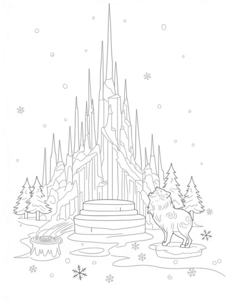 Majestic Ice Palace with Howling Wolf Sculpture Coloring Page