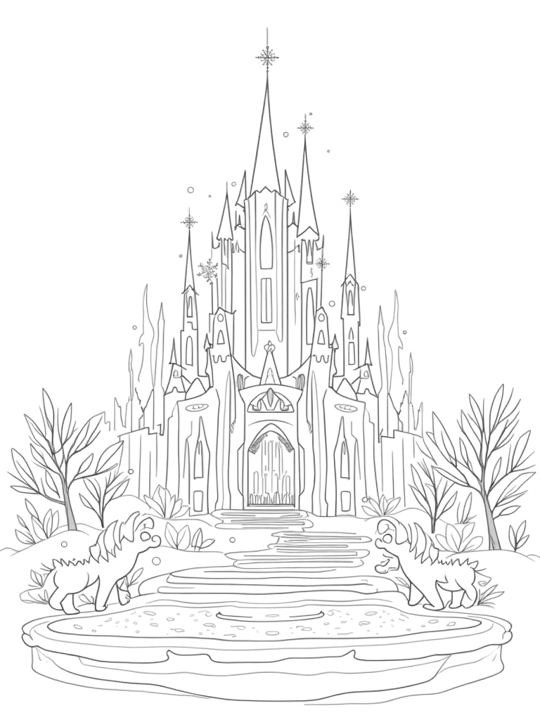Majestic Ice Palace with Mythical Guardians Coloring Page