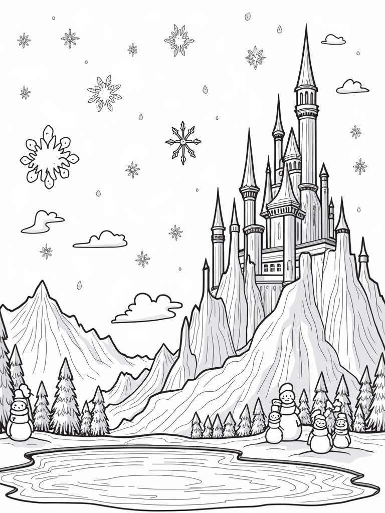 Sparkling Ice Castle on a Mountain Peak Coloring Page