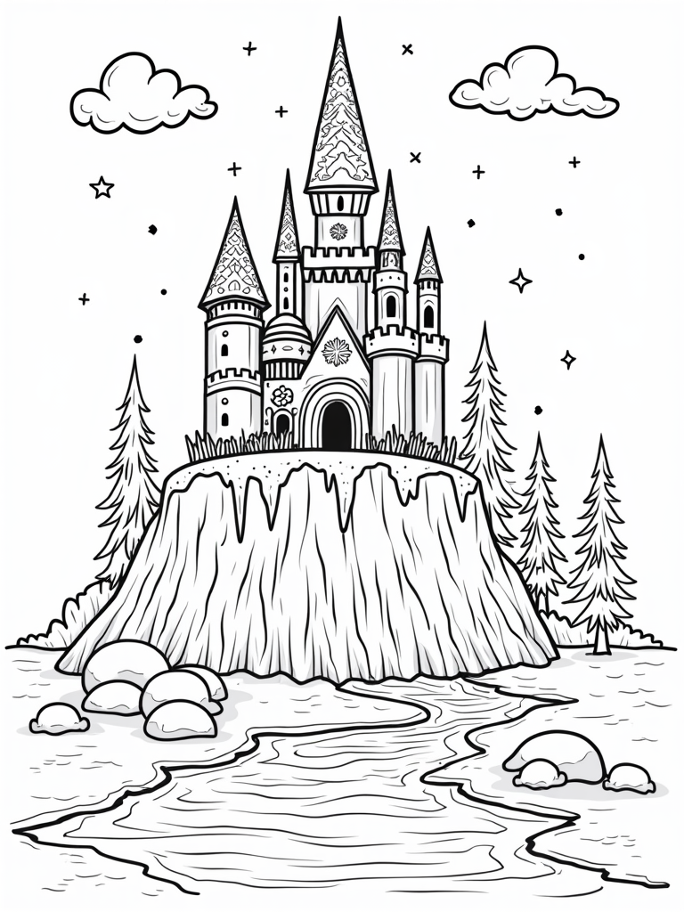 Frosty trees with swirled branches create a magical forest around the castle, while a gentle stream of icy blue water flows nearby. The water reflects the castle’s glimmering facade, adding to the enchanting atmosphere. And up in the sky, fluffy clouds shaped like ice cream cones float by, with twinkling stars peeking out between them. It’s a winter wonderland that's perfect for some colorful creativity!
