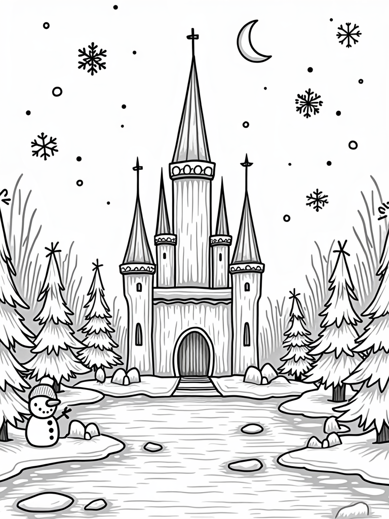 Beneath the castle, a frozen pond mirrors the beauty above, surrounded by frosty trees that resemble delicate crystals. If you look closely, you'll spot adorable snowmen scattered around, each wearing a different hat that adds a touch of personality. Their cheerful faces are sure to bring a smile as you color them in!