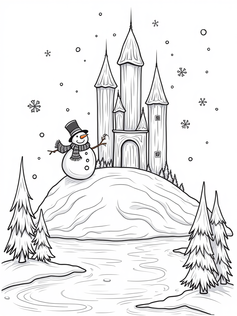 Sparkling Ice Castle with Playful Snowman Coloring Page