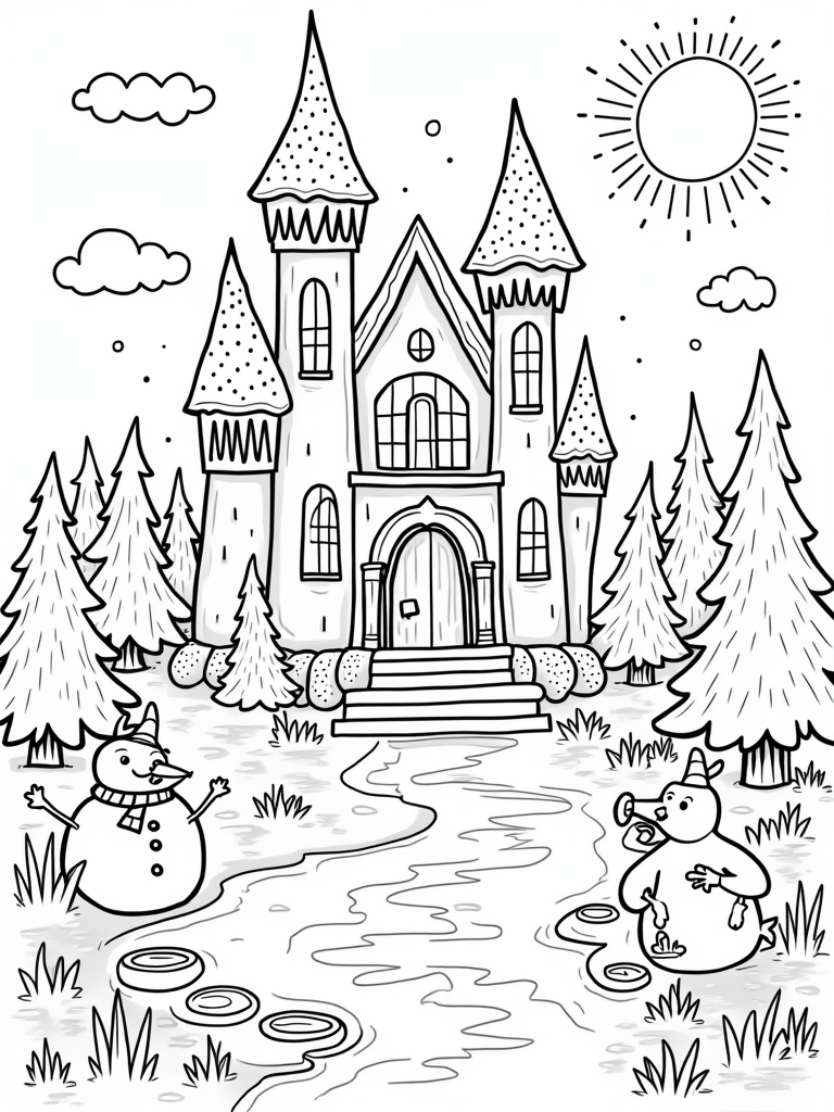 Sparkling Ice Castle with Snowmen and Forest Friends Coloring Page