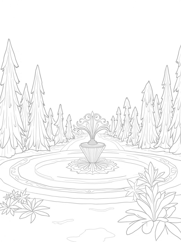 Tranquil Ice Garden with Snowflake Fountain Coloring Page