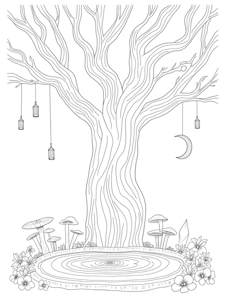 Ancient Tree and Magical Mushrooms Coloring Page