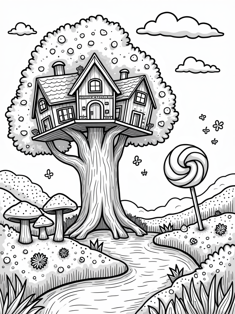 Candy-Coated Treehouse Village with Chocolate River Coloring Page