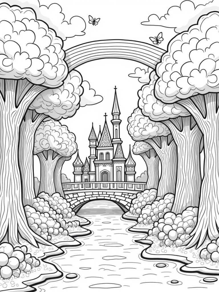 Candy Forest with Chocolate River and Gingerbread Castle Coloring Page