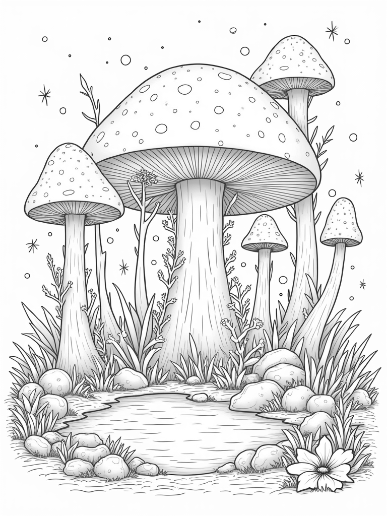 Colossal Mushroom Forest Under a Starry Sky Coloring Page