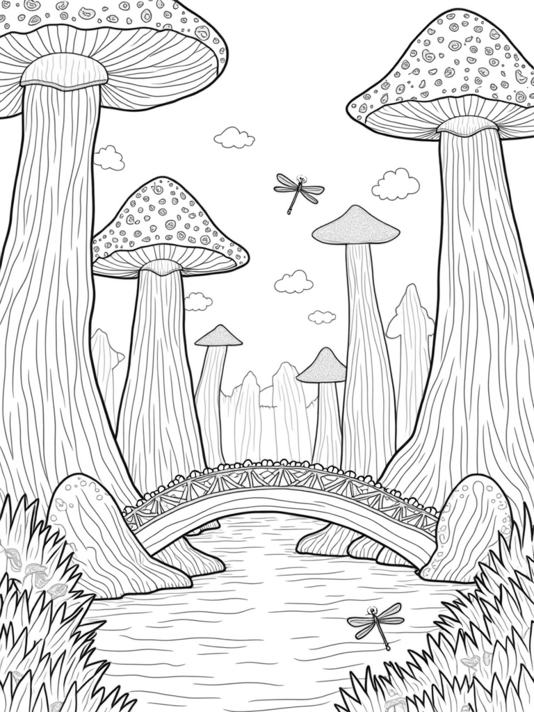 Colossal Mushroom Forest with Floating Dragonfly Lanterns Coloring Page