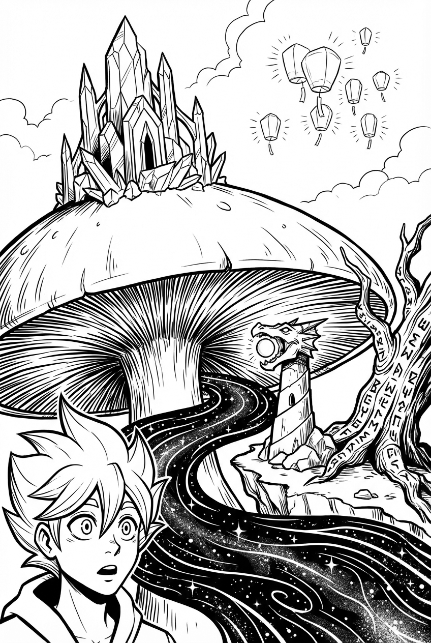 There’s a massive crystal castle balanced on the top of a colossal mushroom cap. The castle’s spiky towers gleam, and a river of starlight snakes through the mushroom’s gills, looking like a glittering ribbon. At the bend of that river sits a dragon‑shaped lighthouse that glows, while a gnarled tree carved with runes leans right next to it. Above it all, a handful of lanterns drift lazily, like fireflies caught in a gentle breeze.