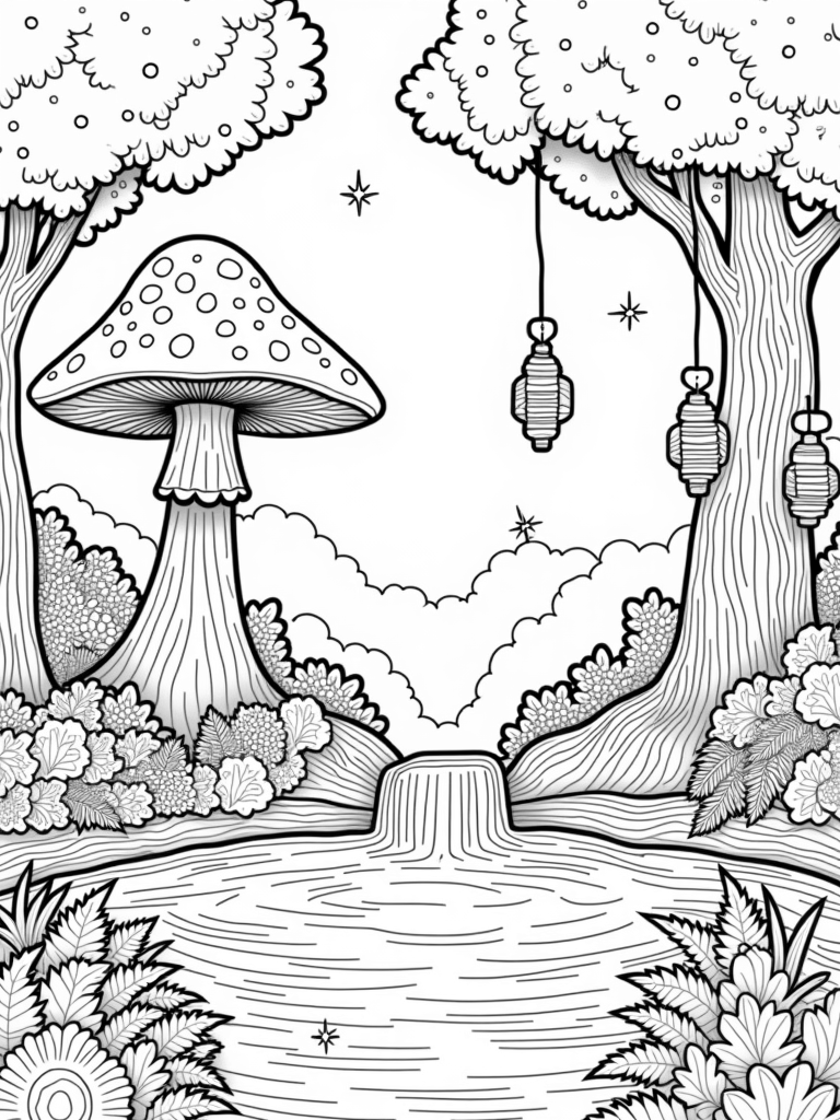 Enchanted Forest Clearing with Giant Mushroom and Sparkling Waterfall Coloring Page