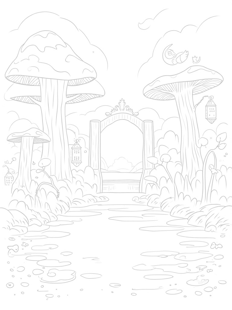 Look closely, and you’ll spot delicate vines wrapping around a weathered stone archway, adding to the enchanting feel. Atop the archway, a glowing lantern sends out swirls of light, creating a cozy atmosphere. Plus, tiny trails of fairy dust sparkle throughout the scene, leading to hidden nooks where fairies might be hiding. There’s so much to bring to life with your crayons or markers!