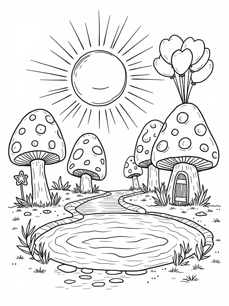 This coloring page showcases a delightful forest glade. You’ll find oversized mushrooms with bright, polka-dotted and striped caps, making them look like something straight out of a fairy tale. In the center, there's a sparkling pond that reflects a giant, smiling sun, whose rays swirl like wavy lines. It’s the perfect spot for some magical fun!