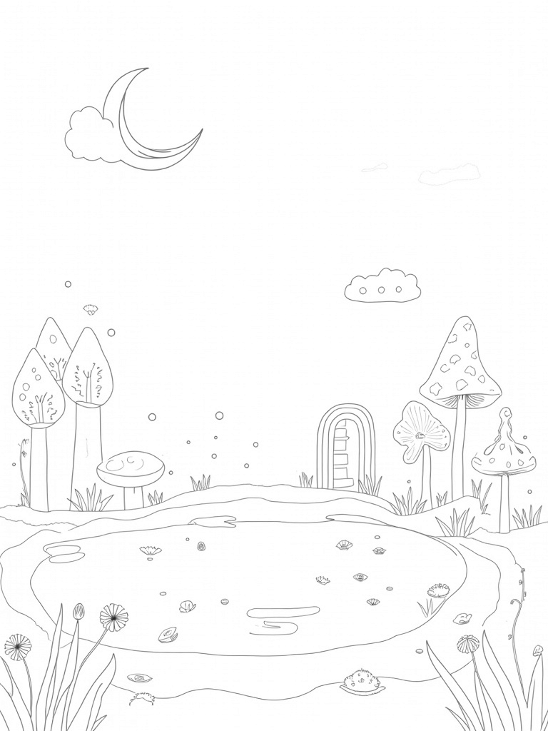 This scene is all about a magical forest glade filled with towering, spiraling mushrooms that look like they came straight out of a fairy tale. At the center, there's a shimmering pond reflecting a beautiful crescent moon, and around it, glowing fireflies dance in the air. It’s the kind of place where you can almost hear the whispers of nature.