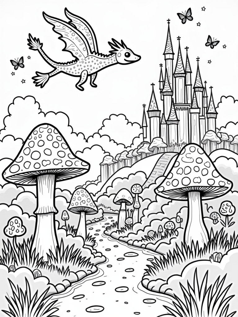 This free printable coloring page is perfect for kids who love fantasy! With an enchanted forest, a candy castle, and a friendly cloud dragon, little artists will have a blast bringing this magical scene to life with their favorite colors.