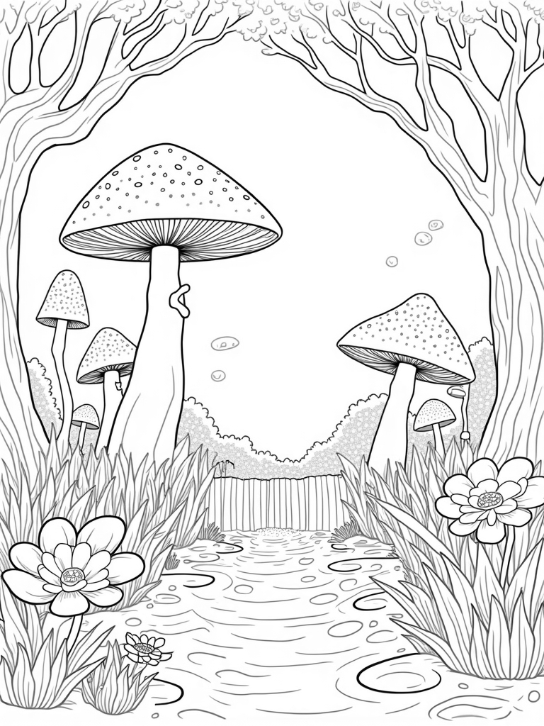 Enchanted Forest with Colossal Mushrooms and Mythical Flowers Coloring Page
