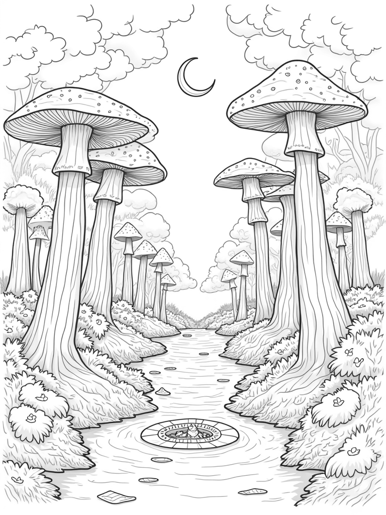 Enchanted Forest with Mushroom Archway and Starry River Coloring Page