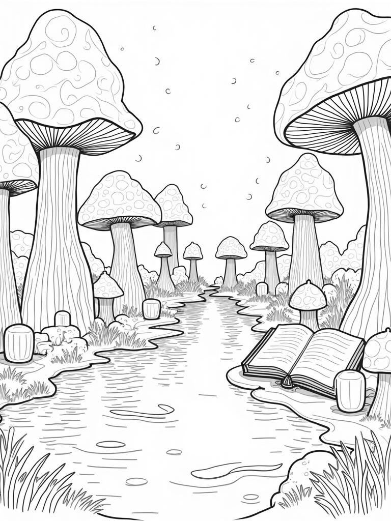 Enchanted Forest with Towering Mushrooms and a Magical Spellbook Coloring Page
