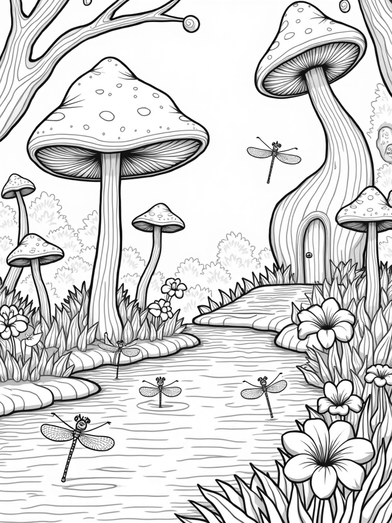 You’ll find yourself in a vibrant enchanted forest where mushrooms of all shapes and sizes stand tall. Each cap is decorated with fun patterns just waiting for your favorite colors. Nearby, a sparkling crystal pond mirrors the sky's hues, creating a magical scene. Look closely, and you might spot delicate dragonflies dancing above the water, their wings shimmering in the sunlight.