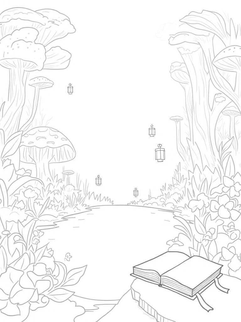 Imagine stepping into a magical forest where the mushrooms are as big as umbrellas, splashed with every color of the rainbow! Right in the middle, there's a sparkling pond that mirrors the sky, surrounded by twisting vines and lush leaves. Look up, and you’ll see glowing lanterns floating gently above the water, casting a warm, inviting light. And don’t miss the giant book resting on a mossy rock nearby, its pages dancing in the breeze, just waiting for someone to read its stories.
