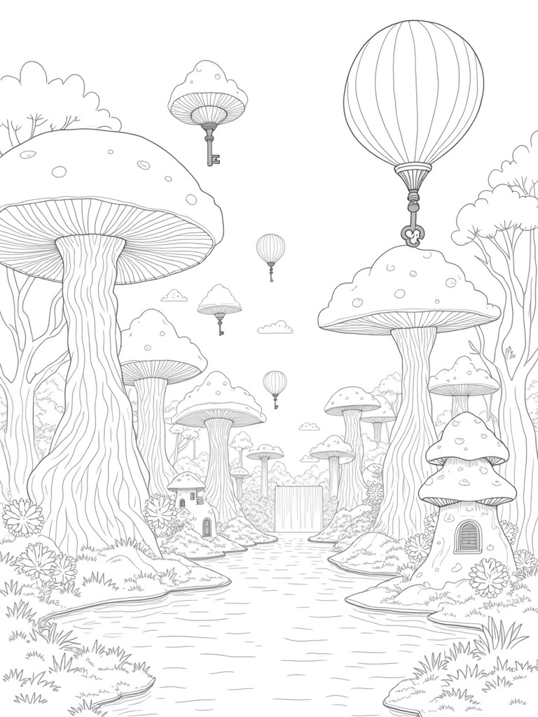 Imagine stepping into a magical forest where trees twist and turn like giant corkscrews. Under their leafy canopies, you’ll find oversized mushrooms that look like they belong in a fairy tale, complete with tiny doors and windows. Don’t forget to check out the sparkling waterfall that tumbles into a crystal-clear pond, reflecting all the vibrant colors of the forest. Above, hot air balloons shaped like fantastic creatures float gently among fluffy clouds, adding a sprinkle of wonder to the scene.