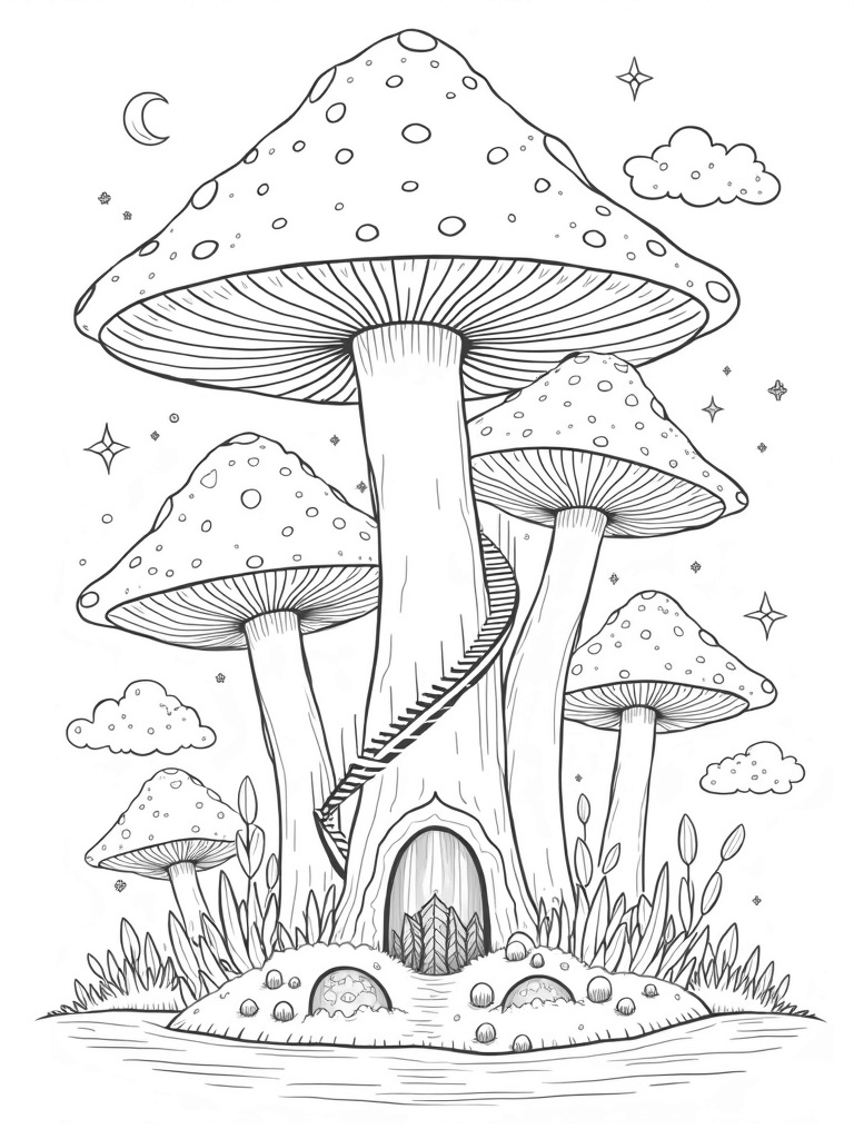 This enchanting scene is all about towering mushrooms with big, polka-dotted caps that create a colorful canopy above. At the base of the largest mushroom, there’s a spiral staircase that leads down into a magical glen filled with sparkling crystals. Just picture it: the light glinting off those gems while fluffy clouds float nearby, each cradling tiny stars and moons. It's like a secret world waiting for your imagination!