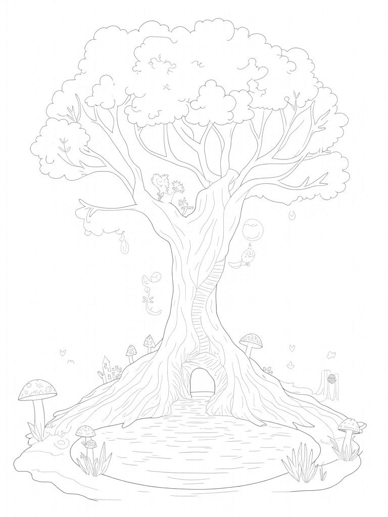 At the base of the tree, a shimmering pool reflects its majestic silhouette, surrounded by oversized mushrooms that look like they belong in a fairy tale. The intricate flower patterns add a touch of whimsy, perfect for coloring! Plus, winding around the trunk is a spiral staircase made of vines, leading to who knows where. Floating islands with castles and waterfalls drift in the sky, making this whole scene feel like a dream.
