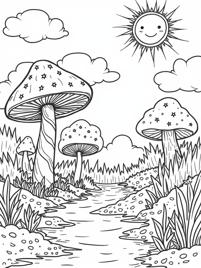 Check out this free, printable coloring page featuring a fantasy forest clearing with vibrant mushrooms, a spiral tree, and a friendly sun. Perfect for kids who love imaginative scenes!