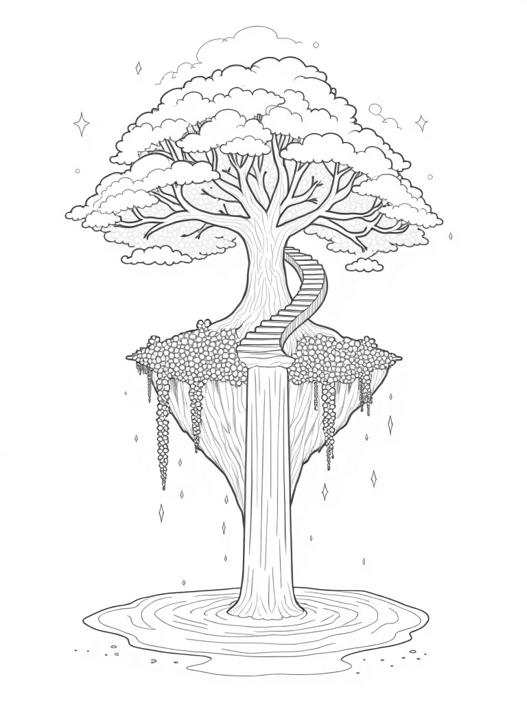 Floating Island with Ancient Tree and Waterfall Coloring Page