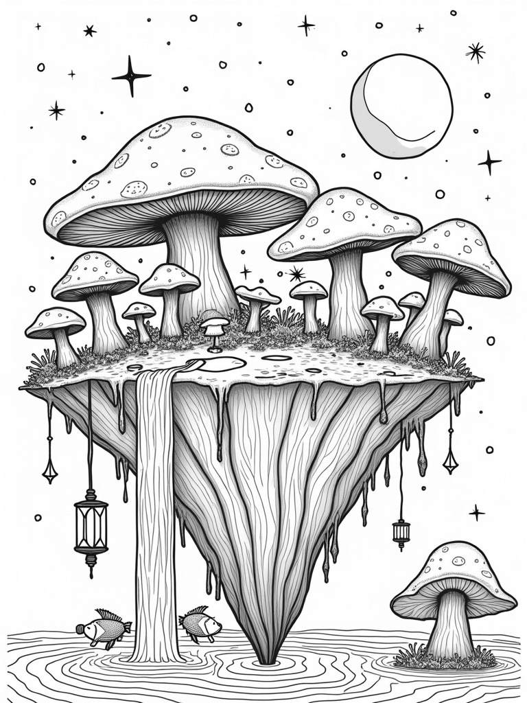 Floating Island with Colorful Mushrooms and Twinkling Lanterns Coloring Page