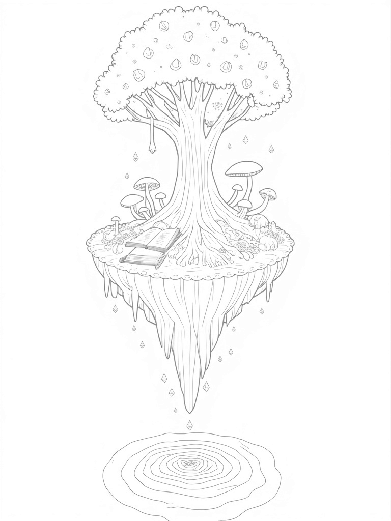 Floating Island with Crystal Tree and Spellbook Coloring Page