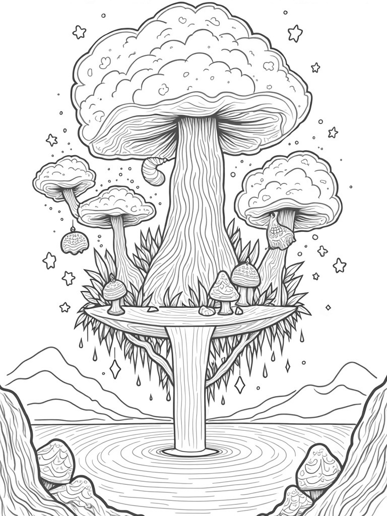 Floating Island with Twisting Trees and a Crystal Waterfall Coloring Page