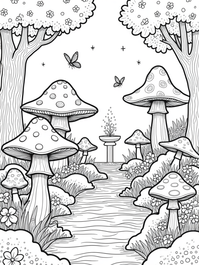 In this enchanting scene, oversized mushrooms with colorful polka dots and stripes dot the landscape, creating a playful atmosphere. Right in the center, a sparkling dragon fountain catches the eye, with water flowing gracefully from its mouth. Butterflies flit around, showcasing their beautiful, intricate wing patterns as they dance among star-like flowers. It's a whimsical gathering that invites you to use your imagination!