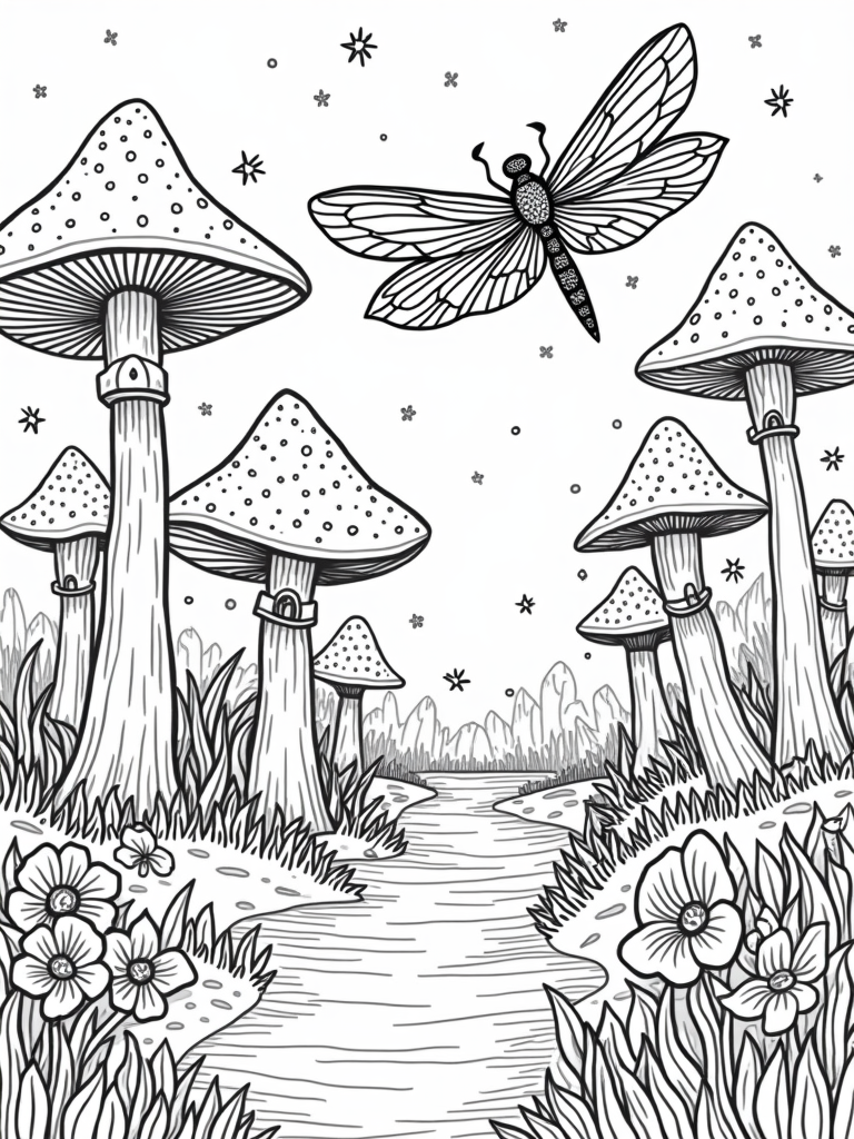 In this enchanting forest clearing, towering mushrooms create a whimsical canopy overhead, each cap dotted with twinkling stars. Beneath this colorful shelter, a winding river sparkles like a rainbow, inviting little artists to bring it to life with their favorite colors. A giant dragonfly hovers above, its wings resembling beautiful stained glass, adding to the magic of the scene.