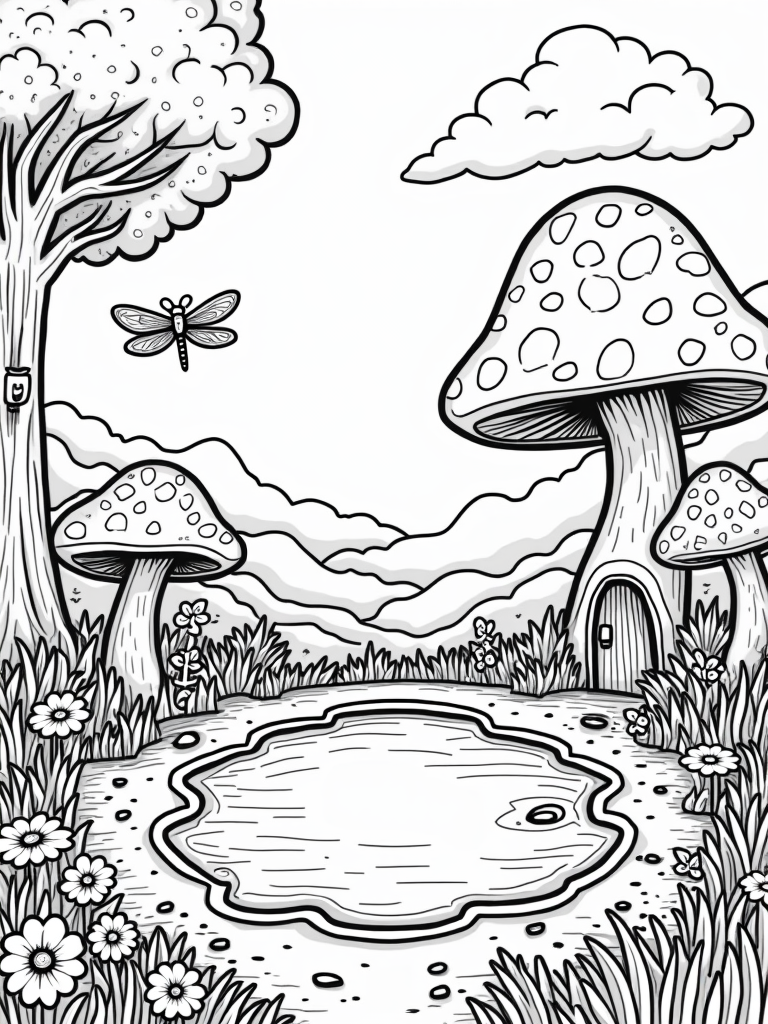 You’re looking at a delightful forest scene bursting with oversized mushrooms decked out in bright patterns. Right in the center, there’s a sparkling crystal pond that seems to dance with colors, surrounded by twisting vines and enchanting flowers. Can you spot the friendly dragonfly with its huge wings hovering over some smiling daisies? It’s like a little piece of magic waiting to be brought to life with your favorite colors!
