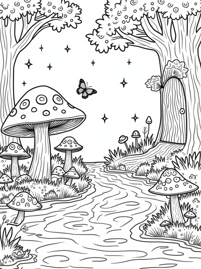 Imagine a magical forest clearing where oversized mushrooms in vibrant patterns pop up everywhere! A sparkling, winding river flows gently through the scene, lined with smooth pebbles that invite you to dip your toes. There's a giant, friendly tree with a whimsical door carved right into its trunk, making it feel like a secret hideaway just waiting for your imagination.