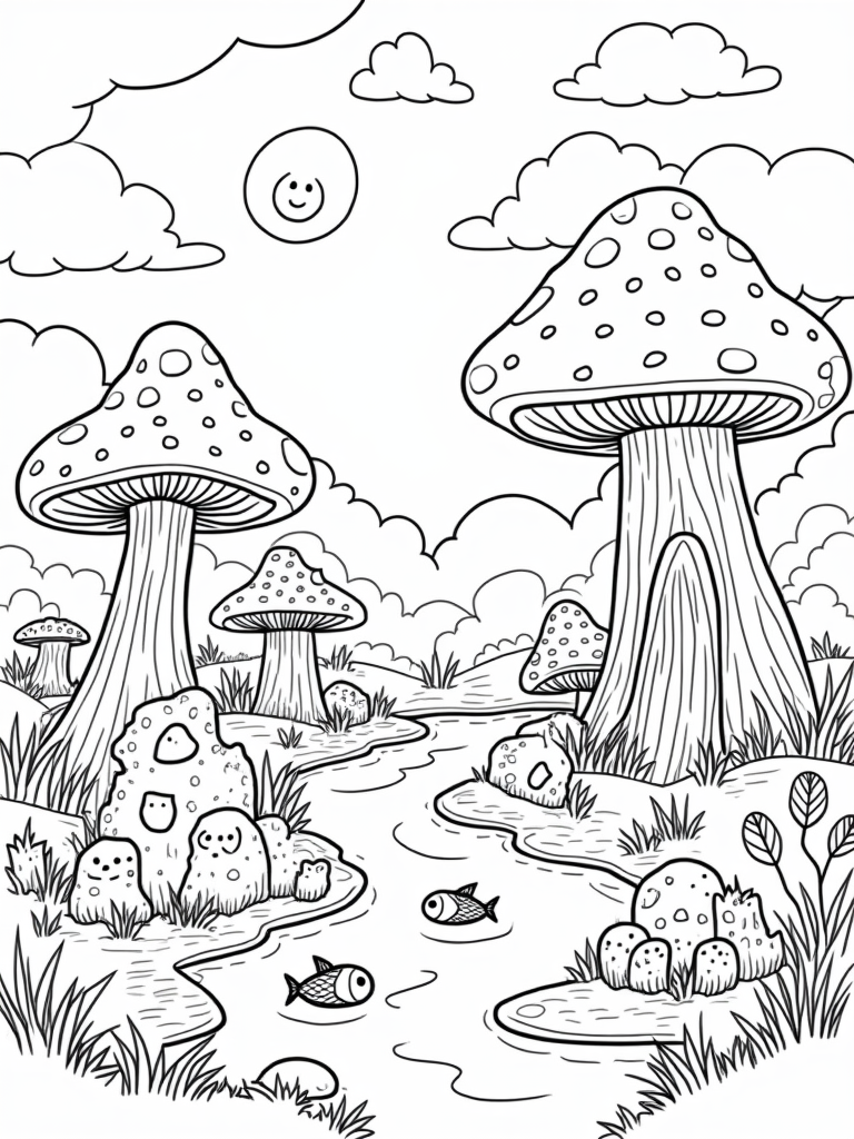 Discover this magical forest glade filled with oversized mushrooms, playful fish, and friendly stone animals. This free, printable coloring page is perfect for kids who love fantasy scenes and want to let their creativity shine!