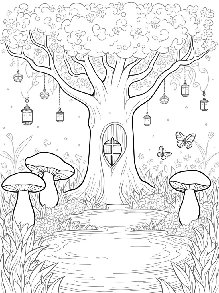 Check out this free, printable coloring page featuring a magical forest glade filled with musical mushrooms, a towering tree, and dancing butterflies. Perfect for kids who love fantasy and creativity!