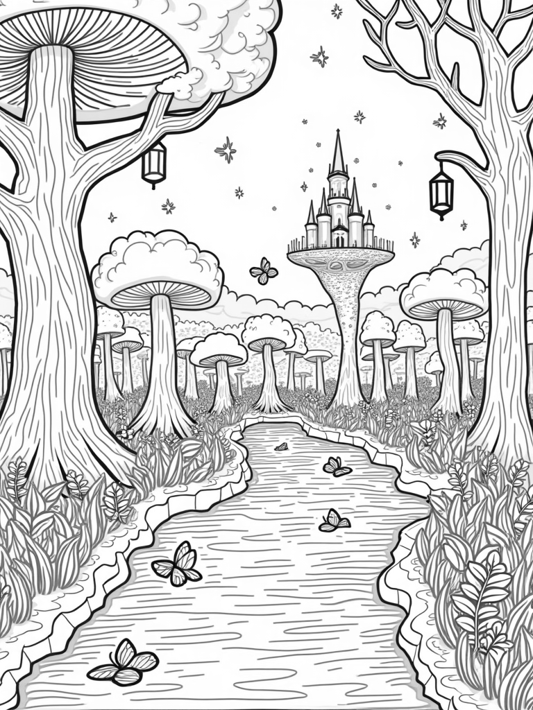 Magical Forest with Musical Mushrooms and a Floating Castle Coloring Page