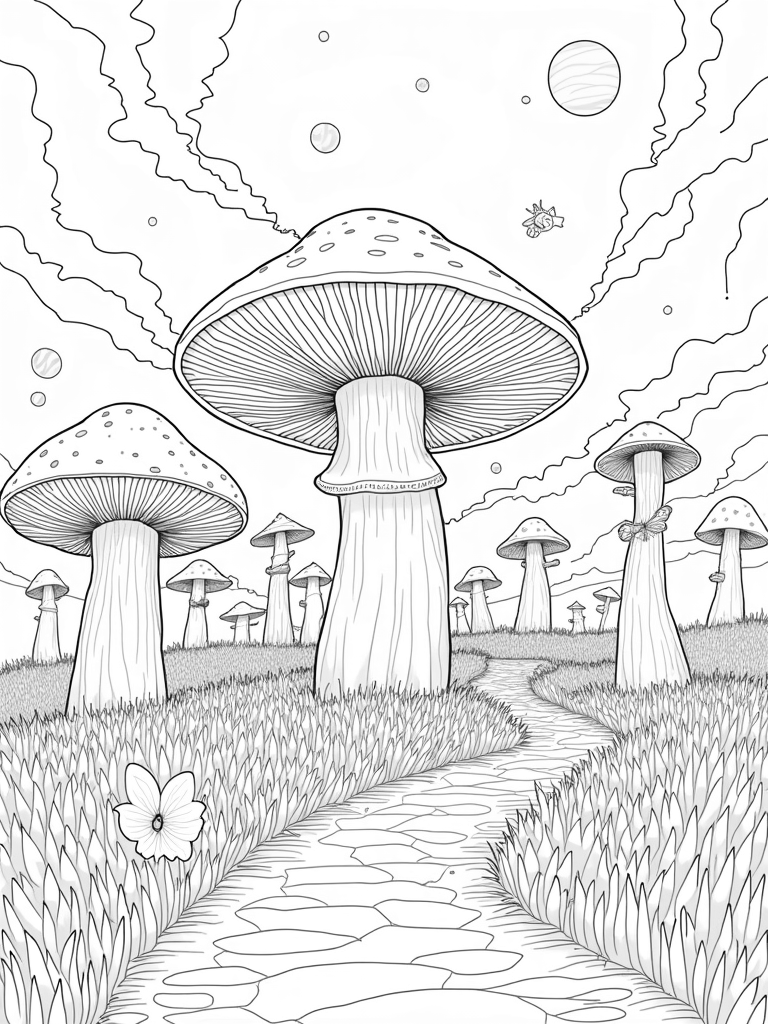 Imagine walking through a colossal mushroom forest where the fungi tower above you like giant umbrellas! The intricate gills on these oversized mushrooms make them look super cool. A winding path of shimmering stones invites you to wander deeper into this enchanting place. And look, there are delicate fairies with butterfly wings flitting around, leaving behind trails of sparkling dust. It’s like a scene straight out of a storybook!