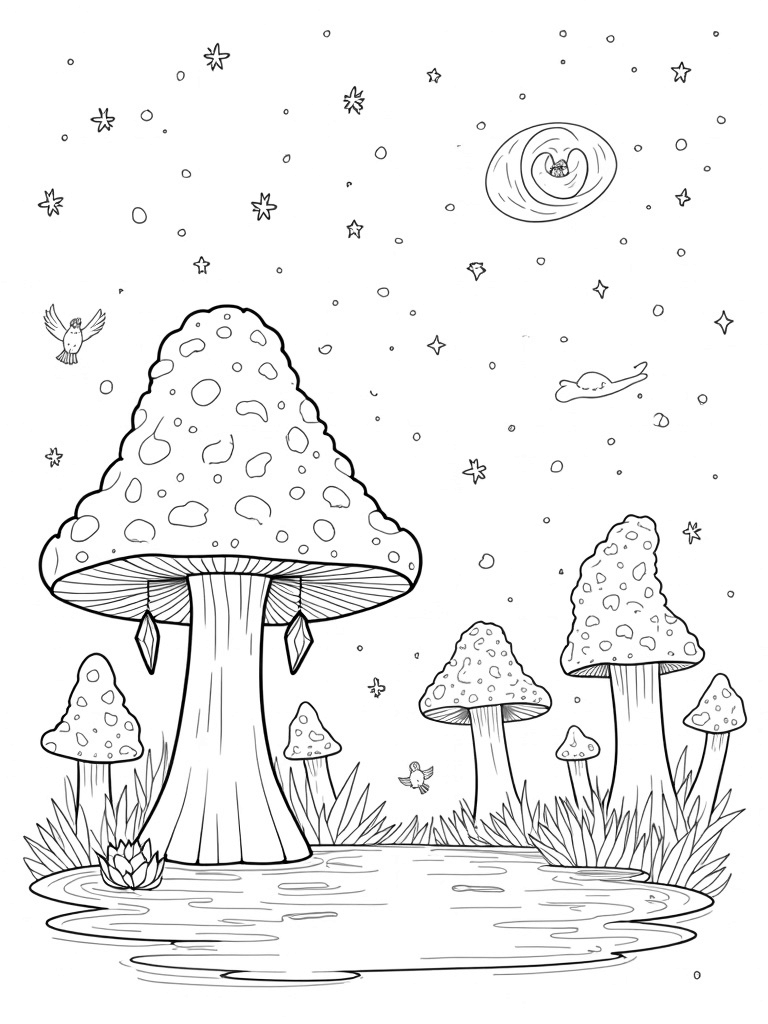 Magical Mushroom Forest with Shimmering Pond Coloring Page