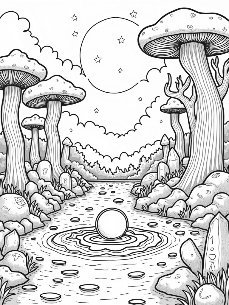 Moonlit Forest Clearing with Towering Mushrooms Coloring Page