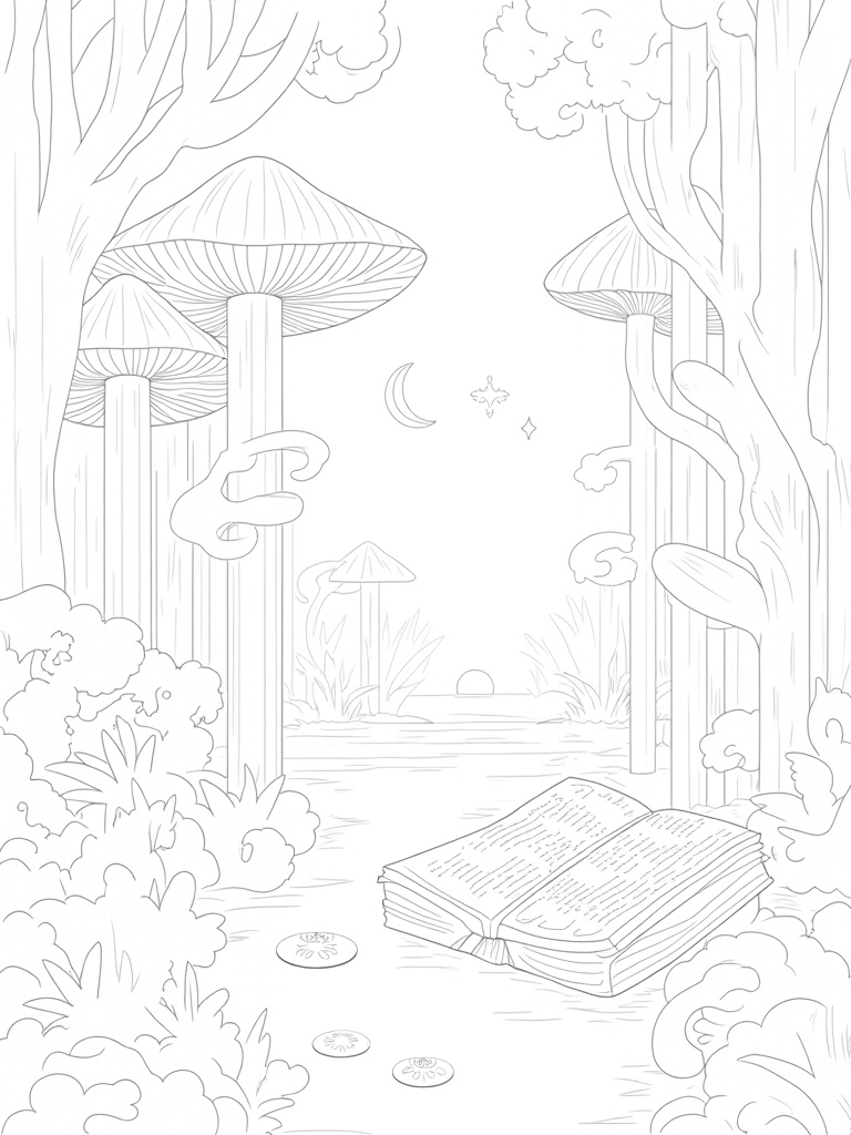 Mushroom Forest Glade with Ancient Book and Lanterns Coloring Page