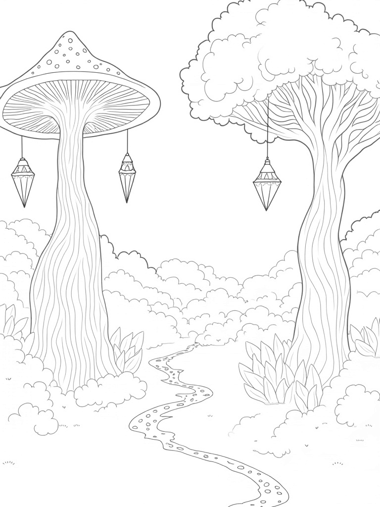 Mushroom Forest with Glowing Lanterns and Stardust River Coloring Page