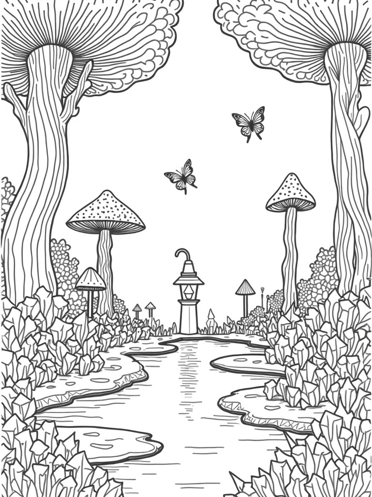 This coloring page invites you into a magical forest glade where towering mushroom trees stretch high into the sky, their caps looking like colorful umbrellas. Under this enchanting canopy, there's a crescent moon-shaped pond that perfectly reflects the whimsical surroundings. It’s a dreamy spot where imagination takes flight!