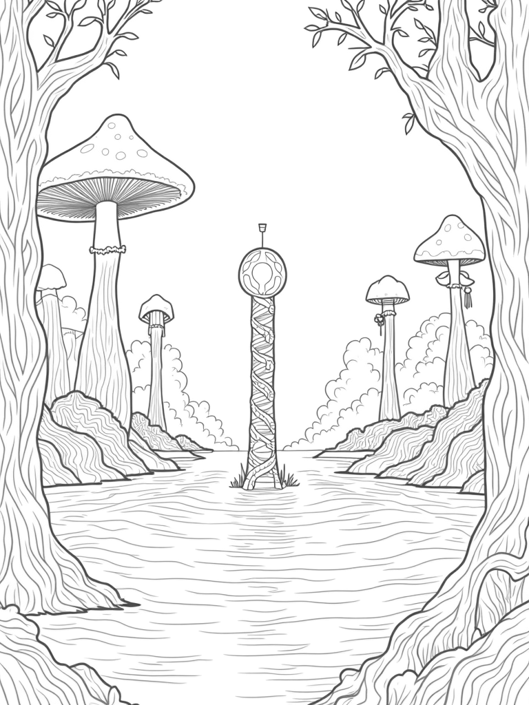 Mystical Forest Clearing with Giant Mushrooms and a Shimmering Pond Coloring Page